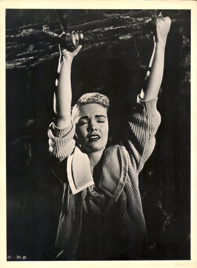 June Kenney dangles from a rope brid– giant spider web in this promotional still from “Earth vs The Spider” (1958).