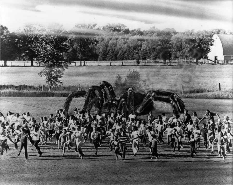 A giant spider chases a crowd of citizens through a field in this touched up promotional image for “The Giant Spider Invasion”.