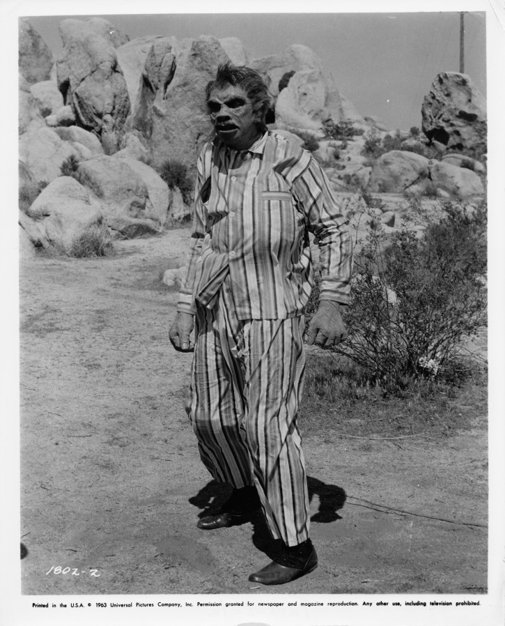 I believe this is Eddie Parker in the monster make-up. He played Paul Lund, Professor Deemer’s unfortunate lab assistant whose actions let loose the tarantula.