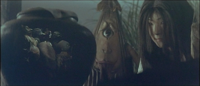The premise of the film is that the ancient Babylonian demon Daimon (Chikara Hashimoto), released by a treasure hunter, settles in the Izu Magesterial Palace and assumes the identity of the magistrate. Noticing that the official’s personality has shifted from gentle thoughtfulness to unrestrained malice, his daughter Chie (Akane Kawasaki) and the samurai Shinhachiro Mayama (Yoshihiko Aoyama) set about removing the imposter. At the same time, Daimon has offended the palaces resident kappa (Gen Kuroki) — a combative water spirit that vaguely resembles a bipedal turtle — driving him from the estate’s pond. It’s a two-pronged assault on the invading demon, as humans and yôkai join forces to take back Izu.