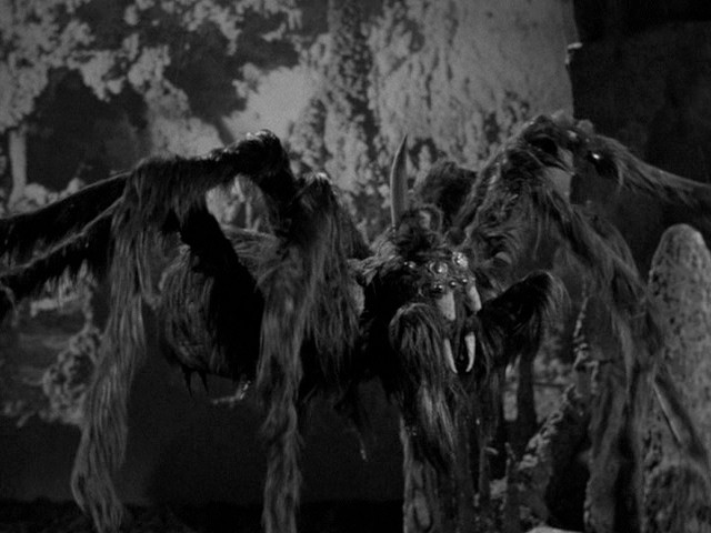 On to the bread and butter! I probably wouldn’t be writing about this film at all if it weren’t for the giant spiders. That’s right, plural. Not that there’s any danger of a mass attack; it’s pretty clear that there’s only one spider prop. It’s a floppy, furry puppet lowered onto its victims by string, waggling its legs randomly. These rather unconvincing space arachnids live in the cave that separates the cat-women’s underground world from the barren surface of the Moon. They’re the only other life around, and since the women don’t seem to fear them you have to wonder what the creatures live on. Each other, maybe.