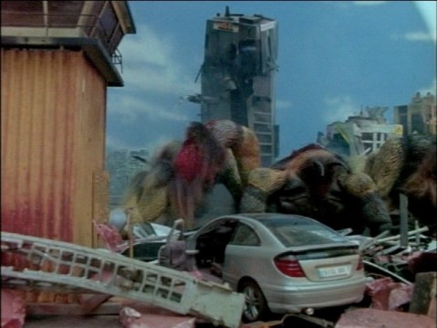 Okay, we all know that the only reason I watched this turd is because it has a giant spider. The giant is formed through the merging of thousands of the tarantula-sized spiders. One potentially neat side-effect of that is that it sheds dead spiders whenever it’s injured. We get one shot of this — featuring CGI that’s on par with Birdemic — and it’s so far away that you have to rely on the dialog to identify the stream of dots. The giant itself looks like a poorly-animated children’s toy, goofy and floppy. It’s so terrible that it makes the miniature footage it’s placed on look almost respectable.