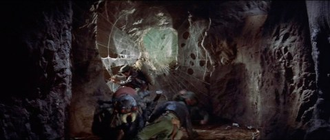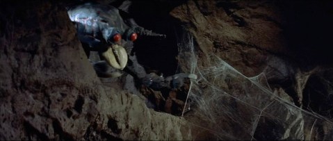 World Without End is not without its pleasures. There are science projects with produce, a subplot involving a treacherous council member, and a duel with the mutate leader. For my money, though, the highlight comes shortly after the crew crash-land into the future. With no idea where (or when) they’ve landed, they descend from the snowy mountains to what is unmistakably a valley in Southern California. They decide to enter a cave for no real reason and walk smack dab into a giant spider web. Seconds later, three of them wrestle a spider prop while the fourth flails around in the web. This is the same spider (and possibly the same cave set) that would appear five years later in Bernds’ Valley of the Dragons, but here it’s not only in color but there’s a second spider! It retreats before their gunfire, but it waggles menacingly from above. These props also appear in Bernds’ Queen of Outer Space, which is probably the most remembered of the three films.