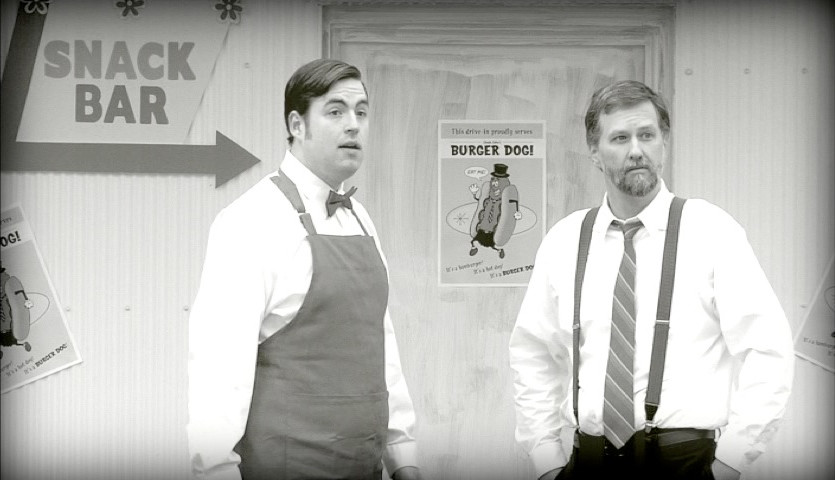 Shot in black and white and run through a mild scratch filter, the film seeks to recall the look of horror films from the late 1950s to early 1960s. It never quite convinces, but I found it easy enough to play along although the cigarette burns are a distraction. The important thing is to be in the mindset of an old monster movie, and the sets and wardrobe certainly help achieve that.