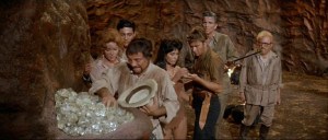 The sets are delightful. One thing Irwin Allen did well in his theatrical films was stretching a budget to good effect. While none of the locations are convincing (aside from some lovely exterior shots, the tarmac, and the lecture hall) they are fully realized. Lots of plants everywhere outside, and thoroughly bumpy rock caverns. Weird angles, torches, and bones dominate the interiors, while the jungle outside is dotted with wide ground flowers that close like traps around unwary professors.