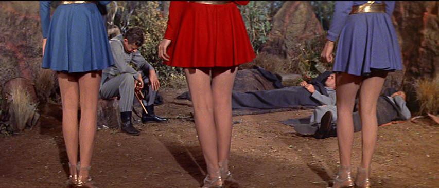 Why this abbreviated history of science fiction films? Legend has it that the plot of Queen Of Outer Space was first laid out by Ben Hecht at a party as a joke, lampooning the tropes of space adventure movies. Whatever the truth of that tale, the film absolutely plays as a tongue in cheek distillation of mid-century science fiction. It’s not the sort of comedy one might expect from Edward Bernds, who’d directed several Three Stooges films. (It’s a pity that Bernd’s did not direct the Three Stooges’ own space parody Have Rocket—Will Travel!) Rather, it’s the sort of stylistic parody that’s difficult to tell from the material it’s targeting. To recognize the wink in the production’s eye, you need to know enough about the films of its time to recognize that it’s a heightened example of the genre.