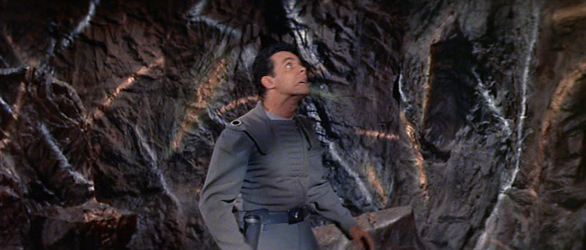 There’s an awful lot of running about until the finale, in which Earth is saved and the Queen is killed trying to save her planet-destroying nuclear ray gun. There are a few things that happen along the way that I want to talk about. The first concerns the central focus of this site. On the run from the Queen’s guards and radar, Talleah and her companions (a few Venusians and the astro-men) take shelter in the obligatory gold-rich cave. The youngest man, Lt. Larry Turner (Patrick Waltz), wanders deeper into the tunnel and is surprised when a leftover prop from World Without End drops on him. It shouldn’t have surprised him; this movie includes quite a few effects and sets from that one, as well as props and costumes from Forbidden Planet.