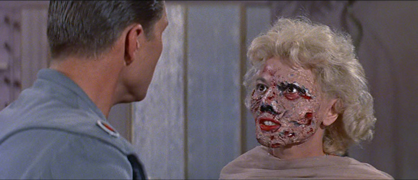 If you’d put your money on “the man-hating Queen is ugly”, you’re right. Sort of. She has radiation damage contained to her face. The interesting thing about this is not the superficial damage but what Prof. Konrad (Paul Birch) surmises. Konrad had earlier deduced that they were on Venus because the air was breathable (meaning that the gravity was basically the same as Earth’s) and he recognized a plant, so his intelligence can’t be questioned. What he says is that the radiation damaged her brain as well. So at the very least her judgement has been clouded since before she led the uprising against the men.