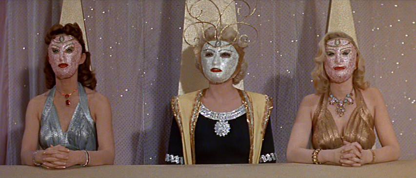 The plot is exactly what you might imagine. Male astronauts arrive on Venus and are captured by women. They learn that there are no other men on the planet, which is ruled by Queen Yllana (Laurie Mitchell) and her council—all of whom conceal their faces behind amazingly awful masks. Where are the men? They’ve largely been killed for nearly killing everyone in the last war. The surviving men (not shown) work on a space station (not shown) designing weaponry for Queen Yllana’s forces.