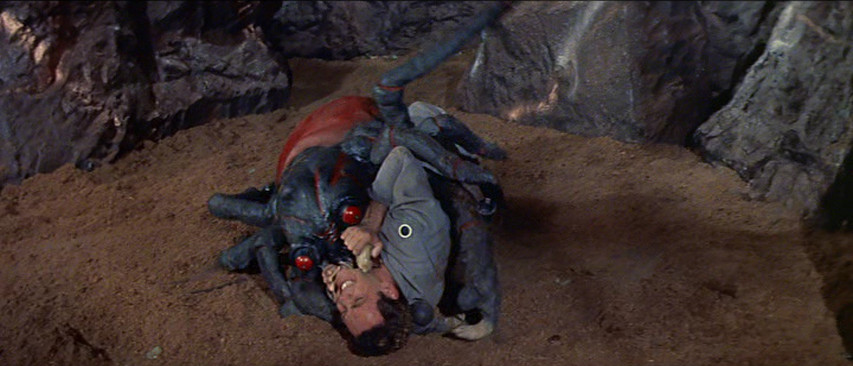 What lands on Turner is, of course, a spider. It had seen better days, and a little more screen time, in Bernds’ World Without End. Here it lands on Turner, who gamely attempts to make it look like he’s struggling with the immobile prop. He’s quickly saved by a disintegration ray, and the incident is quickly forgotten about, but don’t worry—the prop will return in Bernds’ Valley of the Dragons! But for now there’s more running around to do!