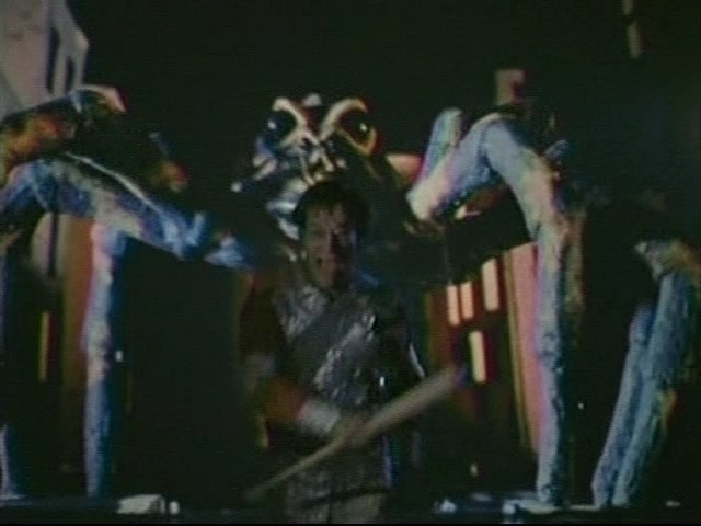So, now that I’ve explained why I would never recommend this film to anybody, I’ll move on to the part I mostly liked. Hank is running around looking for Nancy, who’s running away from the rape gang. When he leans up against a wall, an insectile leg reaches down toward him. It’s a big goddamn spider, and it chases Hank down the street in some neat stop motion sequences. In reality, Hank is running away from a garbage truck, and why Nancy shoots at it for him I will never figure out.