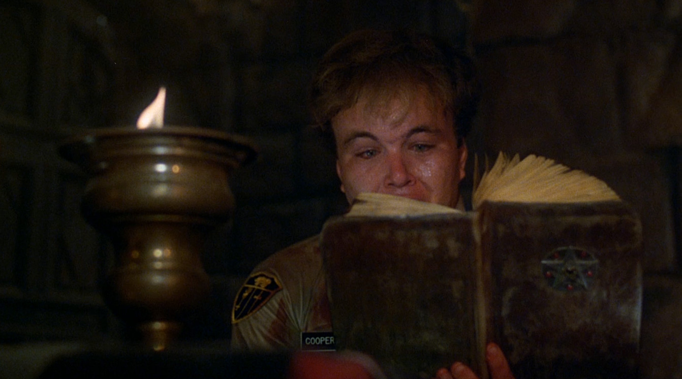 Let me back up. See, Stanley gets punished for being the target of bullies, and he’s ordered to clean the cellar of the church on campus. Nothing good comes from cleaning church cellars, and sure enough Stanley finds a hidden room and an ancient tome. Fortunately it’s in Latin, so he can’t do anything stupid like read it aloud. Too bad he’s a geek, who can make a crappy terminal computer translate it. It is, of course, a book of dark magic; left in this case by Father Esteban (Richard Moll), excommunicated from the Catholic Church and exiled from Spain centuries ago. Stanley’s terminal plugs into Esteban, and before you can say “angry nerd” Stanley is a dark sorcerer unleashing unholy Hell on campus.